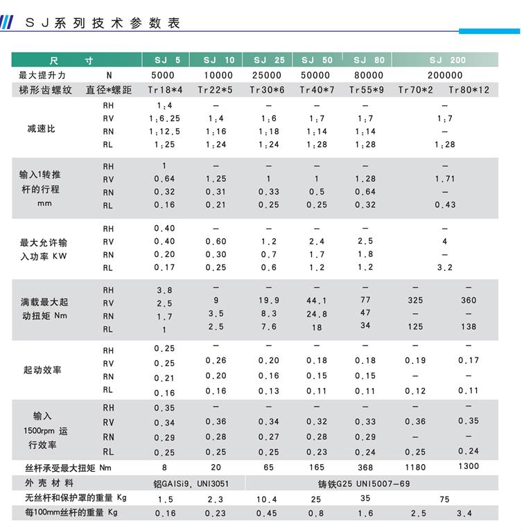 SJ系列升降機(jī)有_的設(shè)計(jì),緊湊的箱體,比MA系列價(jià)格更低,工作制也低。MA系列齒輪箱體設(shè)計(jì)更適合于重負(fù)載、高工作制的場(chǎng)合。SJ系列的負(fù)載范圍在0.5噸~20噸之間,推桿線(xiàn)速度_快可達(dá)到30mm/s,輸入速度_為1500r/min;輸入形式多樣,10分鐘的工作制為20%,工作環(huán)境溫度為-10℃~70℃;而MA系列的負(fù)載_可達(dá)到35噸,輸入速度更是_達(dá)到3000r/min,可提供雙頭三頭絲桿和滾珠絲桿;附件配置多:限位開(kāi)關(guān),防塵罩,安全螺母,防反轉(zhuǎn)裝置。10分鐘的工作制為30%(環(huán)境溫度為-10℃~70℃)。