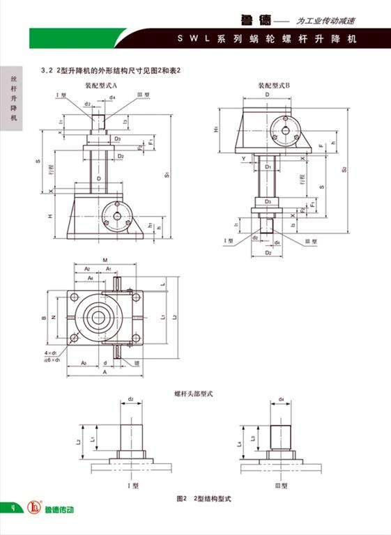 2型結(jié)構(gòu)型式的螺桿頭部分為I型(圓柱型)和III型(螺紋型)。1型結(jié)構(gòu)型式升降機(jī)的防護(hù)有基本型、防旋轉(zhuǎn)型和帶防護(hù)罩型;2型結(jié)構(gòu)型式升降機(jī)防護(hù)有基本型和帶防護(hù)罩兩種。